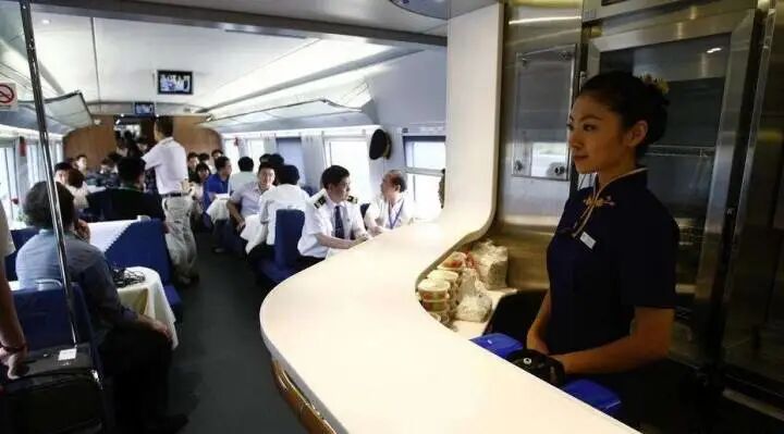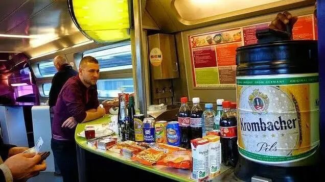 总的来说,欧洲城市短途火车上是没有餐车的。即便设置了餐车,里面根本就没有像样的餐桌和座位,大多数都是站立设计。社交为主,填肚子只是顺带过的事儿。车顶大都采用透明天窗设计,优雅的布置与装潢平添了进食的浪漫和乐趣。相对于质量和口味,价格还说过得去。头等车厢有的套餐服务,是包括在火车票内的,可自主选择。