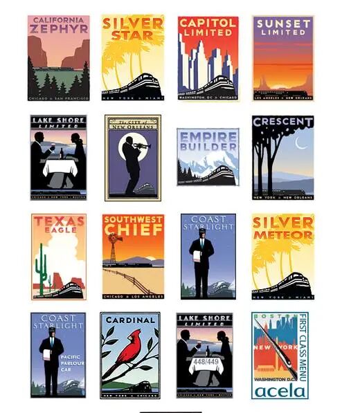 Amtrak美国铁路公司,提供全美客运铁路服务。因为有极其发达的公路和飞机网挤压,客运铁路逐渐变成了鸡肋。为了吸引更多的观光客,很多铁路线路都打造拥有自己特色的品牌。比如从芝加哥前往旧金山湾区的California Zephyr加州和风号,从芝加哥经德州圣安东尼奥前往洛杉矶的Texas Eagle德州老鹰号,从纽约前往多伦多的Maple Leaf枫叶号,各具特色连海报都单独设计。