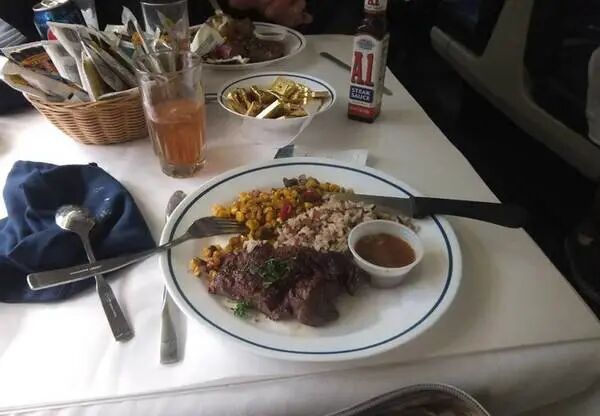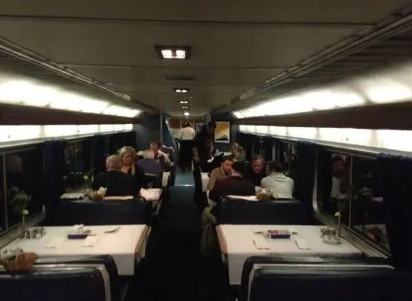 美国火车保留上世纪末美式西餐店型服务,乘客用餐以体验为主,享受为辅。用餐、看景与社交三不误。饭点前列车员会在车厢广播通知,然后一节节车厢走过来接受座位预约。到就餐时间凭预约券,前往餐车安排落座就餐。价格比普通餐厅略贵一点。