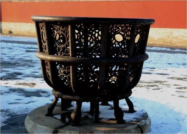 一般烤火就用炭盆。为防止火灾,炭盆外制作有精美的透气笼罩,称为“熏笼”。早在商周时期,贵族阶层就使用以青铜铸就的熏炉,其中,要数汉代的错金铜博山炉最著名。宫里使用铜质,民间多用陶土、铁制作。炭盆取暖也不是每一座宫殿、每一个人都能享用,而是有严格的等级制度。“皇帝妃嫔中答应、常在等地位低下的人就没有资格使用炭盆取暖”。宫里冬季使用燃料无外乎煤、炭、木柴,熏殿用的火盆主要使用红箩炭,由易州(今河北易县)一带山中硬木烧成,运到红箩厂,按尺寸锯截,每根长尺许,圆径二三寸不等,放在圆形荆筐里,外刷红土,表明宫廷特供。这种炭很耐烧,不会爆出火星。