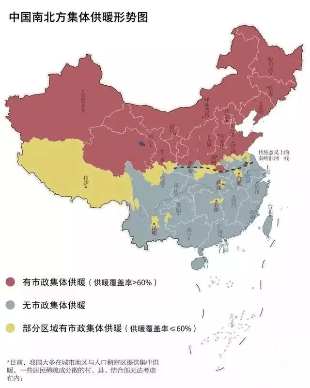 “火炕”退出后,我国北方开始改用蜂窝煤炉取暖,由于仅靠炉身和烟囱散热,故只能围着炉子取暖,留下许多“炉花生”“烤地瓜”的回忆。中国的集中供暖线以秦岭-淮河为界,北边的有,南边的没。北方集中供暖,多以每年11月15日开始至3月15日(有的也可能半年之久),通过地面盘管,管道里有循环流动的热水传送热量。即使外面寒风凛冽,装有暖气的家里温度也可达到20℃以上,在家穿件单衣足够,比烤火、上炕,更自由,更方便。