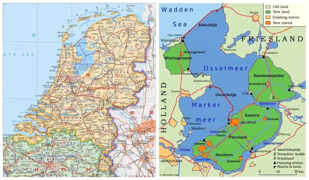 早在1282年,一个不知名的荷兰木匠就造出了第一台水泵风车。这种风车的原型可能来自中东,由东征归来的十字军记录下其外形与用途后传入欧洲。由于西欧常年盛行西风,风车可以最大限度地利用风能,日夜不间断地工作,才使得低于海平面位置的水能被源源不断地送入大海。须德海的形成,客观上也联通了荷兰内部的各城镇,形成了很多港口(1573年10月11日,荷兰“海上乞丐”在须德海上以弱胜强,战胜了西班牙舰队)。