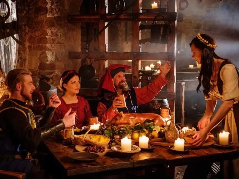 中世纪人们的饮食严重依赖谷物,尤其是各种小麦。下层阶级通常吃大麦、燕麦、黑麦和豆子,而上层阶级吃小麦(用于面包、粥和意大利面)。大多数基督徒在一年中有三分之一的时间被禁止吃肉。在大斋节和斋戒期间,鸡蛋和奶制品(有时还有鱼)也不允许食用。当时盛宴几乎是男士专享,只有最尊贵的宾客可携眷出席。而主人家的太太为了保持端庄、优雅,往往要躲在一旁与随从吃餐。
