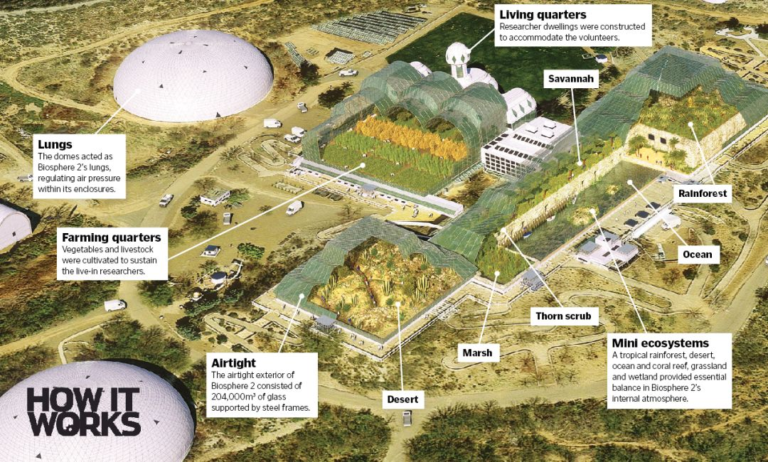 生物圈2号是座占地约3.14英亩(1.27公顷)的钢架结构的玻璃建筑,里面设有多个独立的生态系统:有一片小型的海洋,几块沼泽地、潟湖,一片沙质的海滩,一片热带雨林及一片草场。“生物圈2号”与外界完全隔绝,只有太阳光可进入。这样,在这个生物圈内,植物可为动物提供生存所需的氧气和养料,动物为植物提供二氧化碳,人则靠耕种作物、饲养动物获取食物,而泥土中的微生物又可分解动、植物的尸体及排泄物。这样不断循环,可形成相对稳定的生态系统。