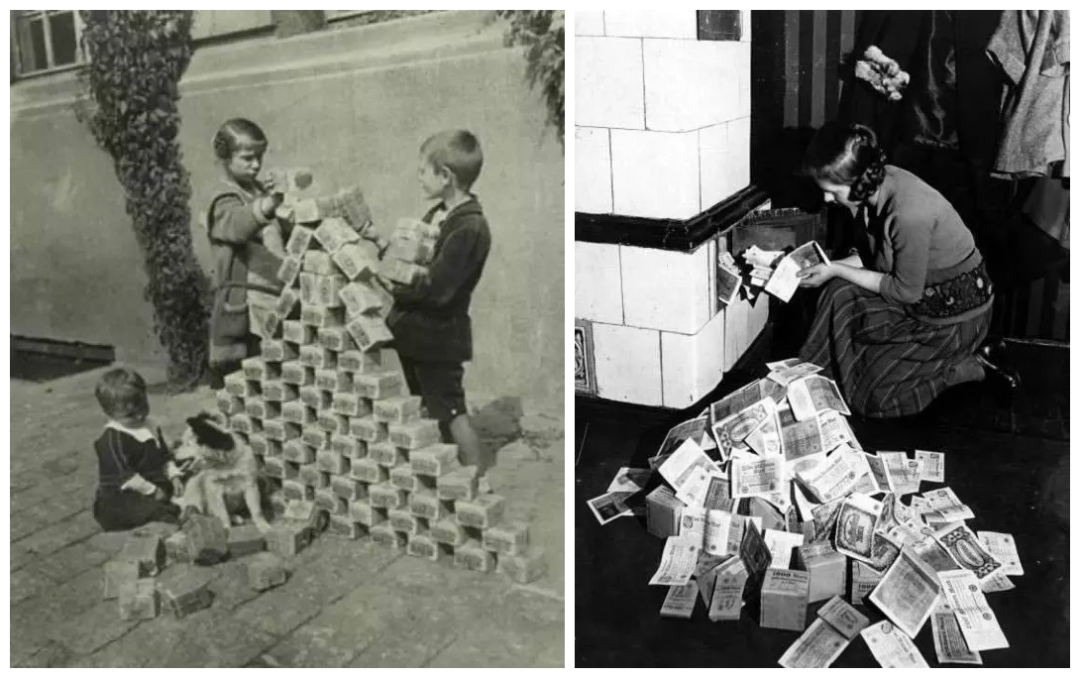 当时德国孩子们经常用成捆的钱做积木,甚至用钱来烧火做饭,因为用马克比柴火更核算。遇到通货膨胀,有人说我在思考是买房子、买车或是买黄金好?事实是,真要是恶性膨胀你买什么都没用(缺的是一个伟大的祖国),钞票失去购买力。食物原材料的价格飞涨,带动其他商品普涨,造成“市面上什么都缺,什么都买不起”的局面。