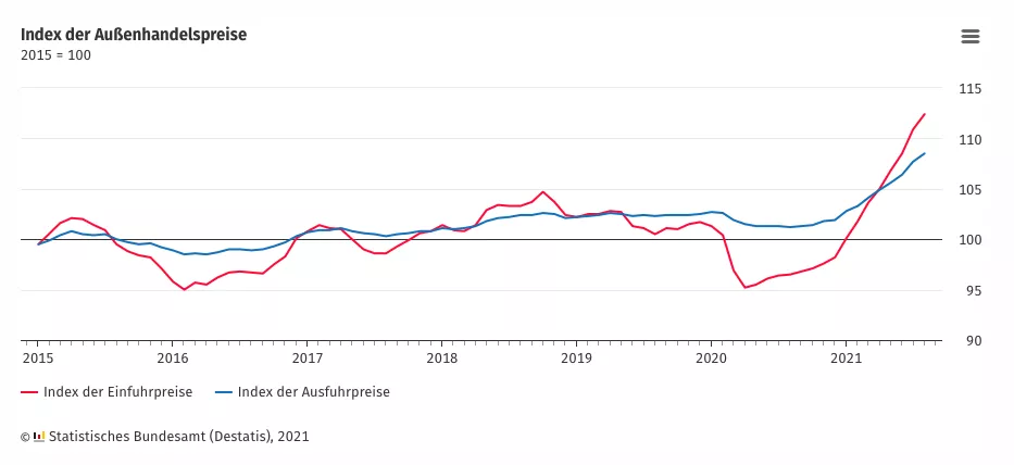 消费习惯不同,通货膨胀水平也因国家各异,在过去的60年间,德国的年平均值约为2%左右。德国官方公布的数据显示,因能源价格上涨以及增值税增加的影响,2021年9月德国消费者物价年增率达4.1%,创下1993年以来的最高增幅。这样一来,进口的产品变得更昂贵。天然气同比增长178%,铁矿石同比增长97%,咖啡同比增长三分之一。公司们如果不想义务劳动,就要想方设法把更高的成本转嫁给消费者。德国百姓忽然紧张起来,频频灵魂拷问:我的钱还安全吗?我还能负担得起现在的生活、还清我的房子贷款吗?