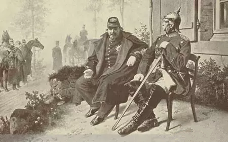 1870年8月6日,普法战争迎来了第一次重大战役——沃斯会战。此役不仅是普鲁士总参谋部体制下“总体战”的胜利,也是德国工业制造的胜利:射程超过法国前膛火炮一倍的克虏伯钢制后膛火炮“粉碎了法国人所有的复仇努力,并将炮弹雨点般地倾泻到法国步兵集结的战线上”。9月1日,拿破仑三世筋疲力尽的右翼军团在距离比利时法国边境7英里的色当被威廉一世的生力军团团包围,次日凌晨,当第一巴伐利亚军团在浓雾掩护下渡过马斯河后,16个克虏伯炮兵连的500门大炮开始轰鸣,身穿奢华礼服的国王本人,参谋总长毛奇元帅、罗恩元帅以及参谋本部的高级军官,首相俾斯麦与全体外交部高级官员和许多德意志邦国的诸侯们在观战:炮弹像“镰刀收割麦子”一样逐渐歼灭了守卫者,黄昏时分,拿破仑三世命令在要塞上升起了白旗。