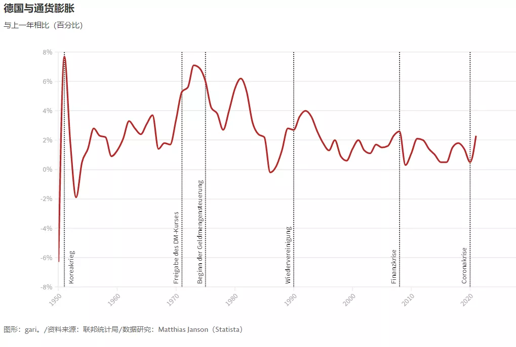 自第二次世界大战以来,德国的通货膨胀可经历起起伏伏,大致可分为四个阶段。1923年(受一战的影响)、1948年(二战后的货币改革)和1990年(至少对于许多无法将资产全部兑换成西德马克的东德人而言)的痛苦经历。2002年,人们将手中强势的、受欢迎的德国马克变成了欧元(与希腊、意大利等对财政赤字的管理明显更宽松的国家共同持有的货币)。