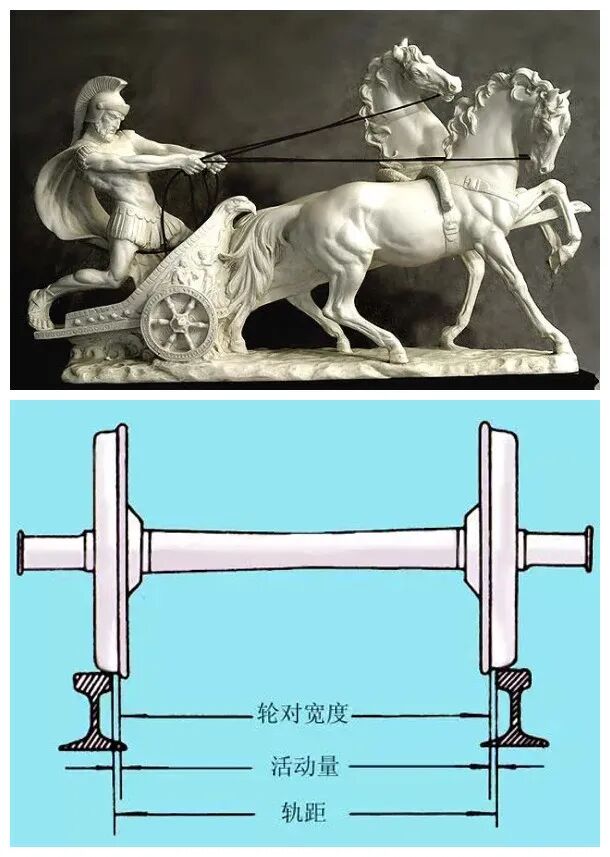 工业革命,直接推动交通运输业的划时代转变。1825年,英国建成了世界上第一条公用铁路,斯托克顿 — 达林顿铁路,27公里。最初的列车由蒸汽机牵引,需要以煤炭或木材作为燃料,“火车”由此而来,蒸汽机车则被称为“火车头”。“火车之父”史蒂芬森在建造曼彻斯特至利物浦铁路时,建议沿用英国马车的轮距4英尺8.5英寸(1937年,国际铁路协会将1435mm定为标准轨距,全世界有大约60%的铁路都属于标准轨距)。而英国马车的轮距,又是沿袭古罗马战车的轮距,即两匹马屁股并行的宽度;