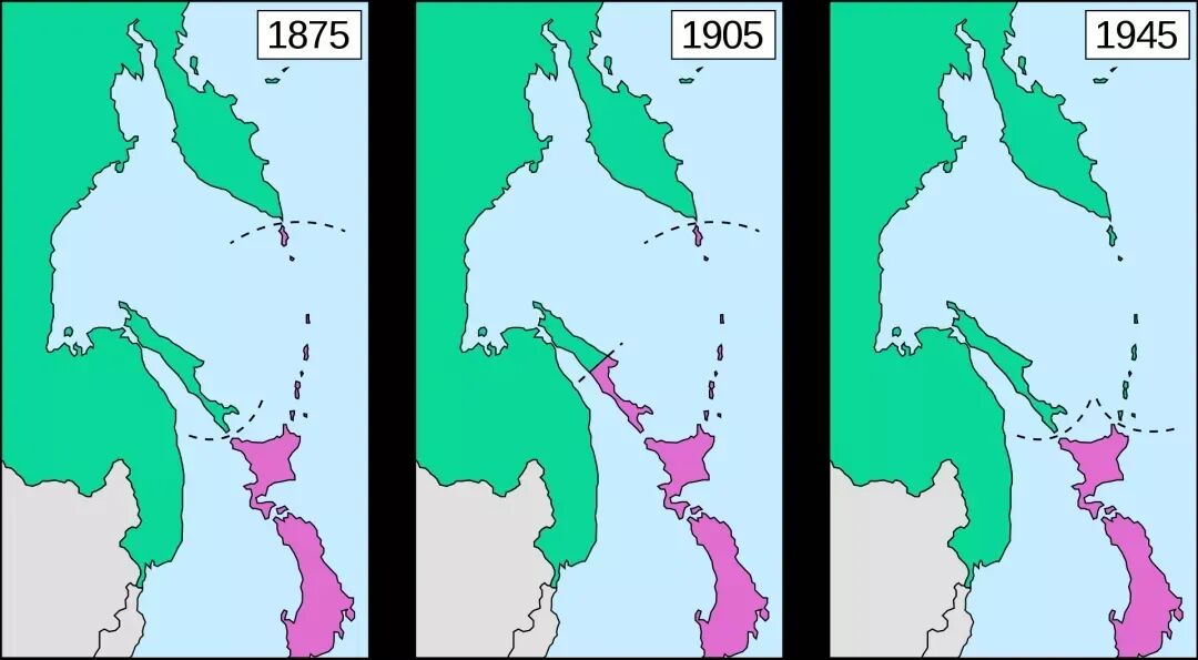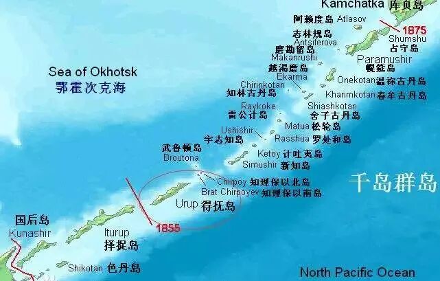 北海道上面还有个库页岛(今萨哈林岛),虽被日本称为北虾夷地,但从隋唐时期开始就一直在中国的管辖之下。清政府对这片地方不太关心,全不在意移民到库页岛的日本商人,导致该岛后被日本实际占领。俄国人当然喜欢这块太平洋方向的天然屏障,在1858年《瑷珲条约》(1860年《中俄北京条约》时生效)强迫清政府割让了这块宝地。幕府倒台之后,日本正式进入到天皇时代。当时的日本战略重心在朝鲜半岛,于是就拿出自己占有的库页岛南部,与俄国的千岛群岛做个交换。双方在1875年签订了《库页岛千岛群岛交换条约》。