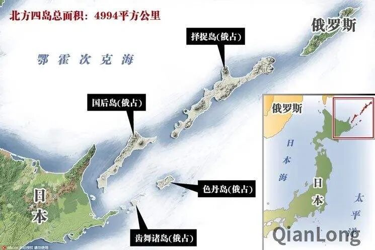 北方四岛(俄国人称南千岛群岛),与千岛群岛、俄罗斯东部勘察加半岛处在同一岛链上,是第一岛链的其中一部分。历史上的北方四岛并不受日、俄任何一国管理,而是虾夷国(北海道)的附属岛屿,当地土著民族也都是由阿伊努人(Ayinum)组成的。