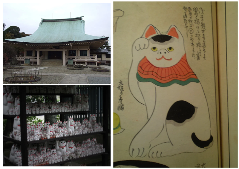 东京世田谷的豪德寺是全日本最有名的招财猫寺院,到处都是参拜者供奉的招财猫,总数到底有多少,恐怕数不胜数。但在江户时代(1603-1868),豪德寺却是没落得门可罗雀。住持养了一只猫(玉),视同骨肉。某天,住持无精打采地对玉说:“如果你知道寺内很贫困的话,能不能招点什么好运给我呢?”