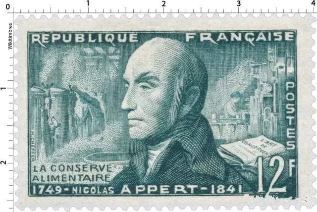 1810年,阿佩尔的“小食品厂”获得了法国国家专利,变成了世界上第一家罐头食物包装厂。阿佩尔的产品伴随着法国大军的南征北战,他本人也名垂青史,法国甚至为他发行过纪念邮票!(1849年,法国人巴斯德(Louis Pasteur)发现食物的腐败是由微生物引起,从而阐明了罐藏的原理,证明了罐头的可靠性和科学性,并科学地制定出罐头生产工艺)。玻璃罐头食品虽然方案可行,不过玻璃本身价格不菲,而且运输途中易碰撞损毁,方案还需要不断改进。