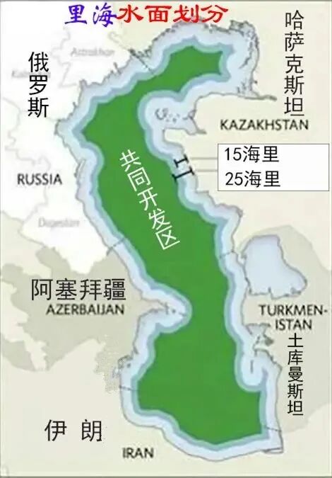 里海水底由相邻的两国协商划界(意思是石油天然气这些水底的资源要划分的,不会共享);