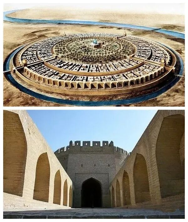 之后,伊拉克地区先后被安息(波斯第二王朝)、萨珊(波斯第三王朝)统治过,直到公元651年,阿拉伯帝国入侵,灭亡萨珊王朝,统治伊拉克地区伊斯兰化。公元762年7月30日,阿巴斯王朝(中国称黑衣大食)的哈里发曼苏尔决定,在巴比伦的废墟上,重新建一座完美的圆形和平之城(巴格达),作为阿拉伯帝国的首都。和东方的四方块城市布局不同,巴格达被设计为一座圆形城市,以皇城为圆心,城墙构成3个同心圆,依次是皇城、内城和外城。三道城墙之上,各设有四道城门,大街从城市的中心如车轮辐条一般伸向城门。皇宫、官邸、清真寺,就在其间。