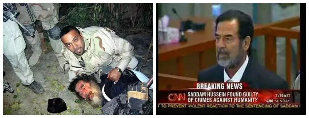 同年12月13日,逃亡数月的萨达姆在家乡提克里特附近一座农舍地洞里被美国特种部队逮捕。昔日的强人向敌人说:“我的名字是萨达姆·侯赛因,我是伊拉克的总统,我想谈判。”2004年6月,萨达姆被移交给伊拉克政府,接受审判。