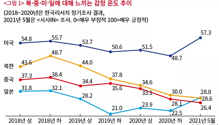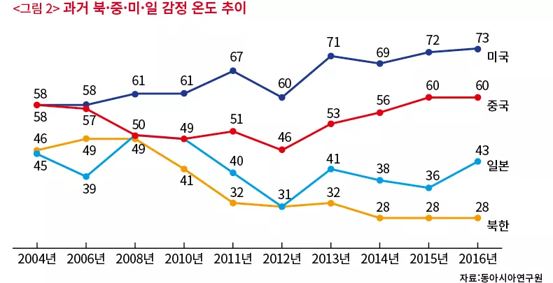 韩国人依旧非常亲美,对美国的情绪热度,是其他国家的两倍。而对于中日朝的情绪热度都很低,对中国的热度降到历史最低的26.4,比日本还低2度。