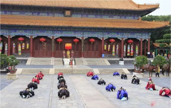 “胡床”传入中国后,渐渐有了高座,凳椅先后问世,原来生活中“跪坐”的习惯消失,但跪拜礼仪保留了下来,成为“九拜”。至于频次,古人相见以再拜为常礼,唯遇特殊情况三拜,“三拜九叩”就成了大礼。臣子拜见君王,子拜父,拜天拜神,新婚夫妇拜天地父母,拜祖拜庙,拜师,拜墓等,都用此大礼。