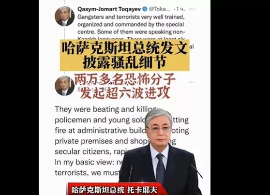 1月8日凌晨,哈萨克斯坦总统托卡耶夫在社交媒体发文,超过两万名恐怖分子累计对阿拉木图发起了至少6轮进攻,“他们中的有些人不讲哈萨克语”,袭击阿拉木图的恐怖分子接受了良好训练,其组织严密,并受“特别中心”的控制。武装分子在阿拉木图公然打砸抢烧、袭击军警、抢夺武器,并开始冲闯老总统府、市政府大楼、检察院、军火库等重要设施,与军队展开巷战,甚至一度占领阿拉木图机场,控制了五架民用飞机。