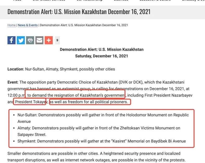 其中,在去年12月15日发布的那一条是明确的“预警”。该预警中,不仅明确指出试图发动叛乱的主体哈萨克民主选择党,还指出了三个主要城市。能提前二周时间就知道哈萨克斯坦必然发生暴乱,显然不是情报能力强,而这本身就是一场代理人策划的行动。