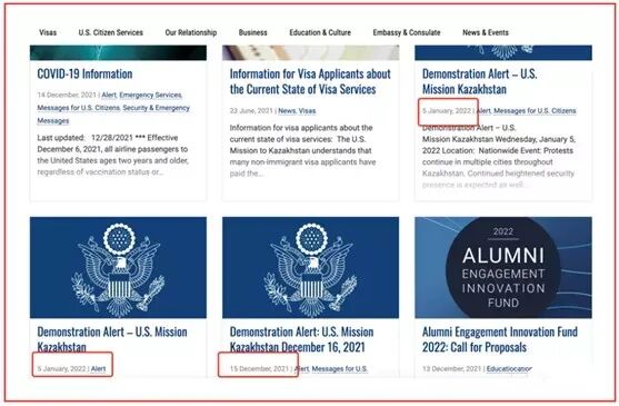 美国使馆未卜先知,美国驻哈使馆官网上,从2021年12月15日到2022年1月5日,他们共发布了三条关于哈萨克斯坦将要或者已发生暴动的信息。