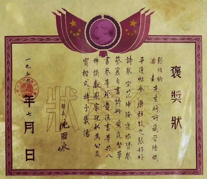 1956年初,北京市民政局召开各界知名人士座谈会,号召大家以带动全市人民购买公债券支援国家建设。张伯驹夫妇有心积极参与,但由于收藏字画之故,尚负债数万,身无余钱,于是,毅然将其数十年收藏书画中,选出八件精品捐献给国家,这八件是晋陆机《平复帖》、唐杜牧《张好好诗》、宋范仲淹《道服赞》卷、宋蔡襄《自书诗》卷、宋黄庭坚《诸上座》卷、宋吴琚《诗帖》卷、元赵孟颍《草书千字文》以及隋代展子虔的《游春图》。这一举动引起文化界的震动,政府欲奖励其20万元,但张伯驹婉言相拒,分文未取。文化部只好给他颁发了一张褒奖令。