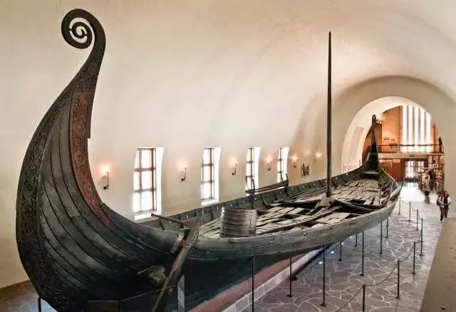 公元8 世纪的北欧,维京海盗横行于海上,以打劫商船为职业。维京人细长的战船取自斯堪的纳维亚特有的橡树,两侧排列着整齐的船桨孔,细长船身不是为了优雅而是为加快速度。此外,维京船最明显的外形标志:船头船尾两头都是尖的,船尾没有舵,这就是“艏艉同形”。这种船可以灵活地利用风力,进入浅水而不必减速。凭借着这一优势,维京人踏上了探索和贸易之旅。英格兰、苏格兰、法国和爱尔兰都留下了维京战舰的痕迹。