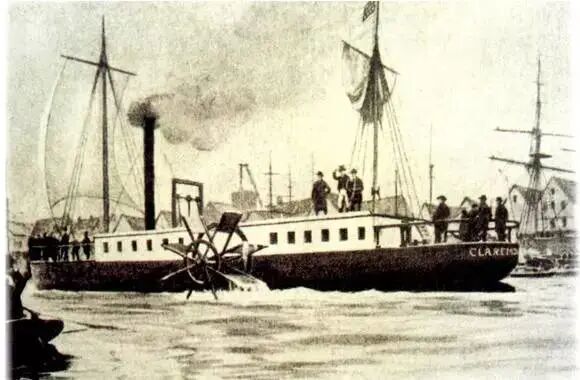 1807年8月17日,美国人富尔顿首次在“克莱蒙脱”号船上用蒸汽机驱动装在两舷的明轮,在哈德逊河上航行。随着蒸汽机的轰鸣声,“克莱装特”号缓缓离岸,驶向江心。一位观众大声尖叫起来:“啊,上帝,那玩意儿真开动啦!”从此机械力开始代替自然力,船舶发展进入新阶段。靠蒸汽机和风机动力混合推进用钢铁制造大船,船体更加坚固耐用。