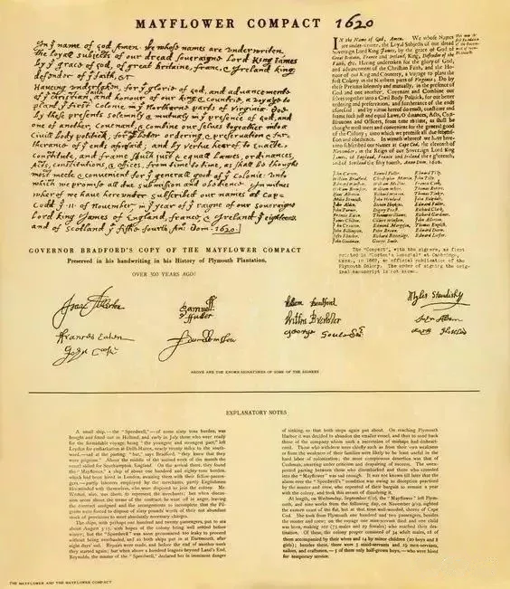 “五月花”号到达科德角的当天,由清教徒领袖主持在船舱内制定了《五月花号公约》,船上的41名成年男子在公约上签字并承诺将共同遵守。普利茅斯上岸后,还没来得及盖好房子,严冬就已来临。短短的三个月里,新移民竟有近半数的人丧生,其中近80%的女子都没能捱过那个冬天(19位妇女仅存活5位)。直到幸存者们与当地的土著印第安人签约划界,交上朋友,并在土著人的指导下学会种植玉米、捕鱼打猎及制做皮毛,才真正立足下来。其后十年,英属殖民地沿着北美东海岸迅速扩张,逐渐发展成为统一的联邦国家——美利坚合众国。