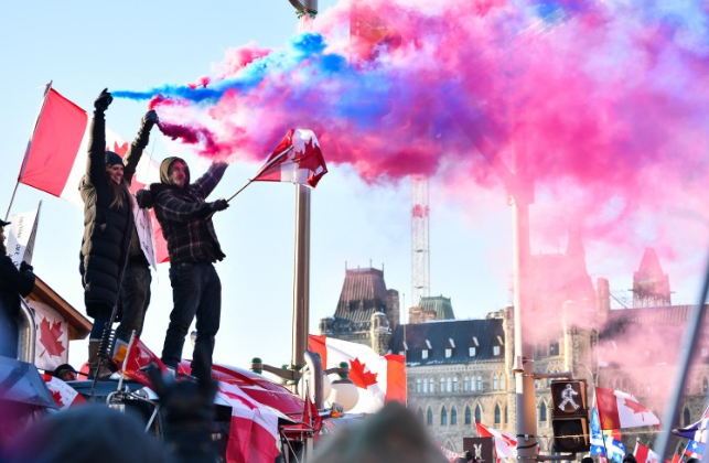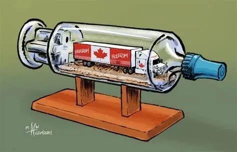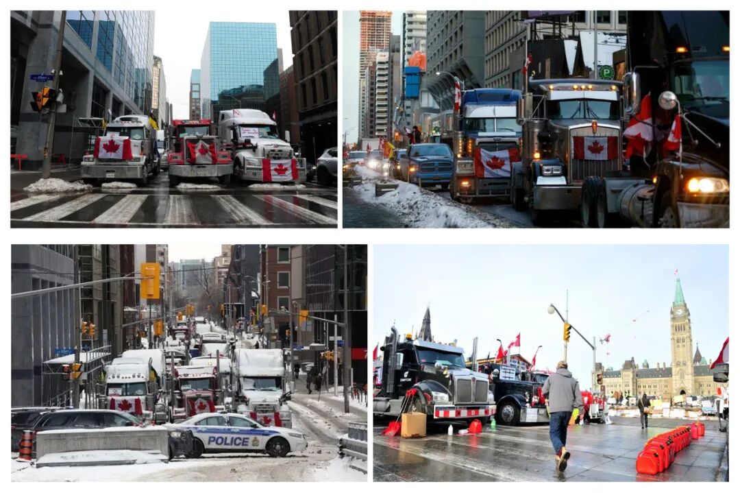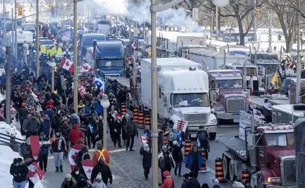 一向还算平静的加拿大,突然冒出了亮丽的风景线。加拿大首都渥太华,卡车司机在国会前围得水泄不通,举着旗示威;在城区随意安营扎寨;不断鸣笛、放音乐,甚至放烟花;500辆重型卡车停在所谓“红区”,导致多处交通瘫痪。美加边境口岸被阻塞,美汽车产业供应链也收到波及。