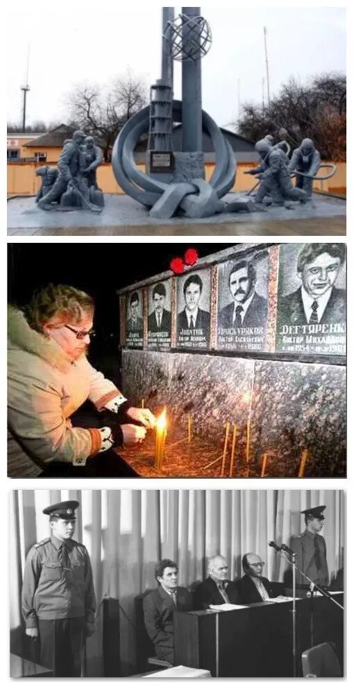 爆炸发生后7个月,清理工作基本完毕,石棺也打造完成。远远望去,石棺就像一座由钢筋水泥堆积成的巨大坟墓。一年后,在莫斯科明基斯克公墓,当局树立了一座“无名纪念碑”,碑身底下数米深埋着28口铅制棺材,因为他们的遗体本身也具放射性。这些逝者是切尔诺贝利核泄漏事故中最先遇难的核电站员工和消防员,纪念碑上写着这么一句话“历史上从来没有这么少的人,为挽救这么多的人,而直面死亡,并做出了这么伟大的牺牲!”事后,副总工程师佳特洛夫(中)被判处10年监禁,9年后去世。