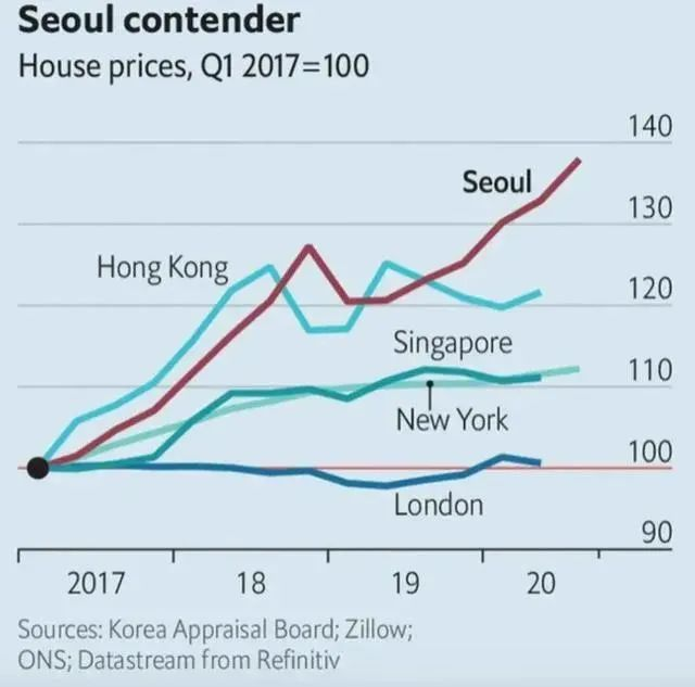 文在寅上台以来,为了兑现选举承诺,刺激韩国底层中青年的就业,一直奉行积极的货币政策。遇到疫情危机,韩国接连两次降息、宣布了50万亿韩元的经济刺激计划。市场上的钱多了,总要有个去处,经济疲软期各行各业都不看好,唯有房子最保值,于是大家本能的都去买房子。