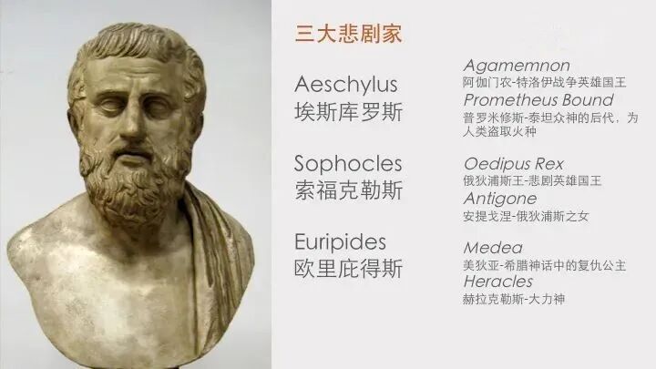 喜剧、悲剧之外,还有讽刺剧,但艺术价值最高的还是赚足人眼泪的悲剧。古希腊的三大悲剧家:埃斯库罗斯、索福克勒斯、欧里庇得斯。作品多以古希腊神话中的神或者英雄为主角。对神、英雄和命运的思考,是古希腊戏剧的一大传统。这样的传统,在西方文学中一直在传承。