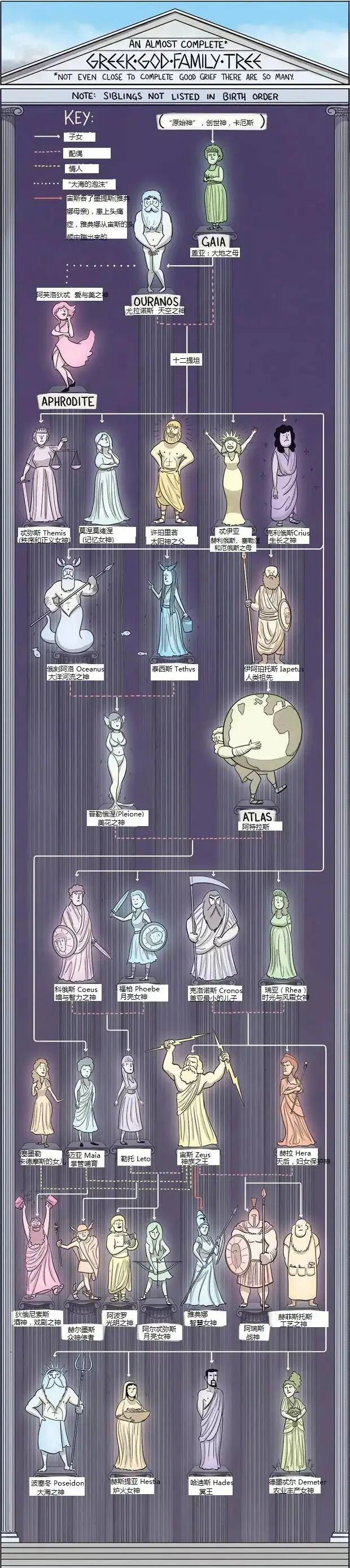 盖亚是创世神,没人跟她生孩子,于是她就无性繁殖,生了3个神,分别是:海洋之神、天空之神、山脉之神。随后,天空之神乌拉诺斯与盖亚(是的,他母亲)一起造了很多孩子,十二个泰坦巨神,三个独巨神和三个百臂巨神,是世界的开端。这些巨神彼此结合,生出最早的赫利俄斯(Helios;日)、塞勒涅(Selene;月)、厄俄斯(Eos;黎明)、阿斯特赖俄斯(Astraea;星辰)等许多神。