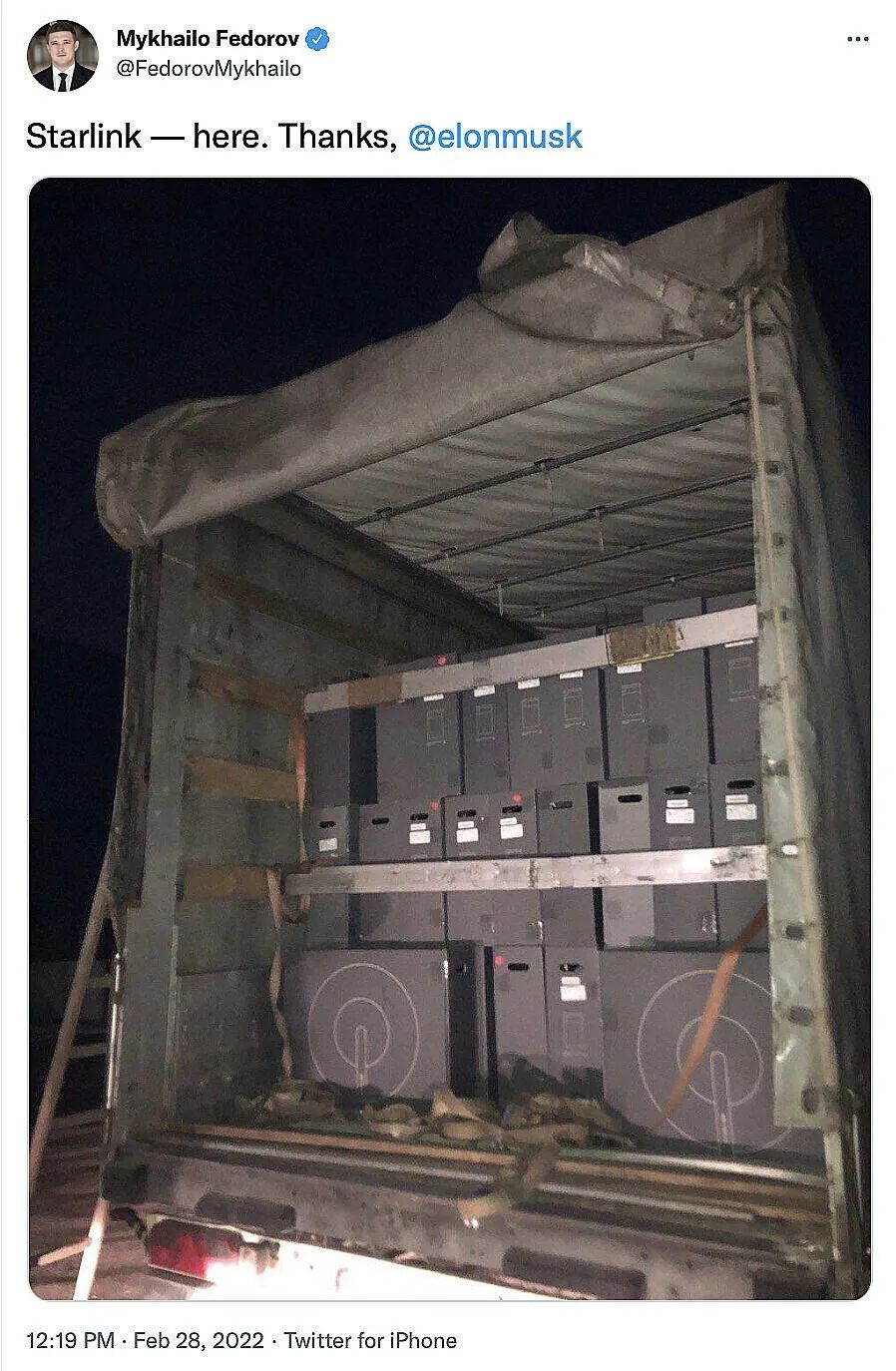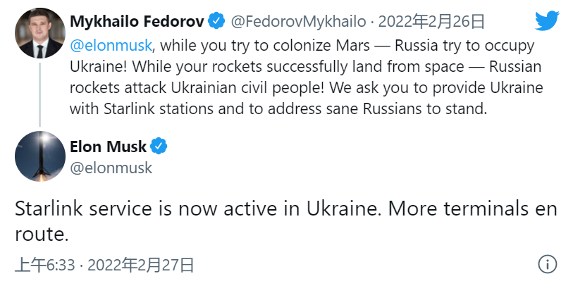 乌克兰副总理米哈伊洛・费多罗夫(Mykhailo Fedorov)于 2022年2月26日在推特上发文@ SpaceX 的CEO马斯克,向他求助说,俄罗斯军队扰乱了乌克兰的互联网基础设施,请求他在乌克兰开通星链(Starlink)的宽带互联网服务。于是乎,马斯克“参战”了。