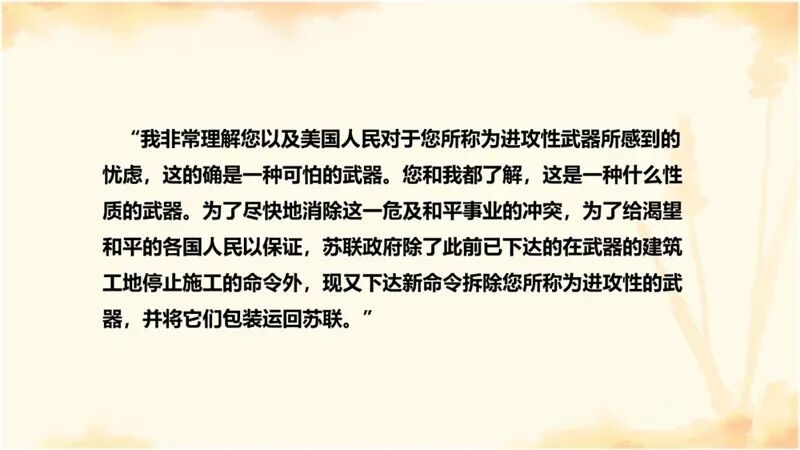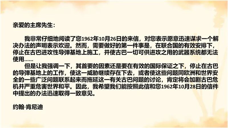 肯尼迪给苏联领导人赫鲁晓夫写了封信:“我并不认为您抑或其他任何理智的人,会在这个核时代故意让世界陷入战争,这场战争没有任何国家会成为赢家,最终只会对全世界造成灾难性的后果,包括挑衅者在内。”