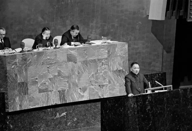 1974年,联合国总部决定于4月9日召开联合国第六届特别会议,由于这是中国恢复联合国常任理事国席位后首次派遣高级代表团出席联合国大会。4月10日下午,总设计师健步走上联合国大会讲台。面对一百多个国家的代表团和众多记者,从容不迫地开始全面、系统地阐述三个世界的理论,并论述了中国的对外政策:“从国际关系的变化看,现在的世界实际上存在互相联系又互相矛盾着的三个方面、三个世界。美国、苏联是第一世界。亚非拉发展中国家和其他地区的发展中国家,是第三世界。处于这两者之间的发达国家是第二世界。”
