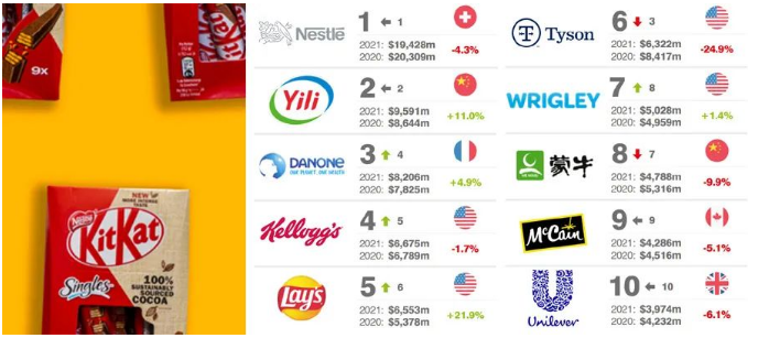 在首次公布的全球食品品牌价值100强(Food 100)榜单上,雀巢、伊利、达能名列前三位。100个食品品牌总价值2210亿美元。中国上榜的10大品牌为:伊利、蒙牛、海天、统一、康师傅、旺旺、光明乳业、双汇、万洲国际和中粮(100个里面,我们才占了10个,是不是有点少)。