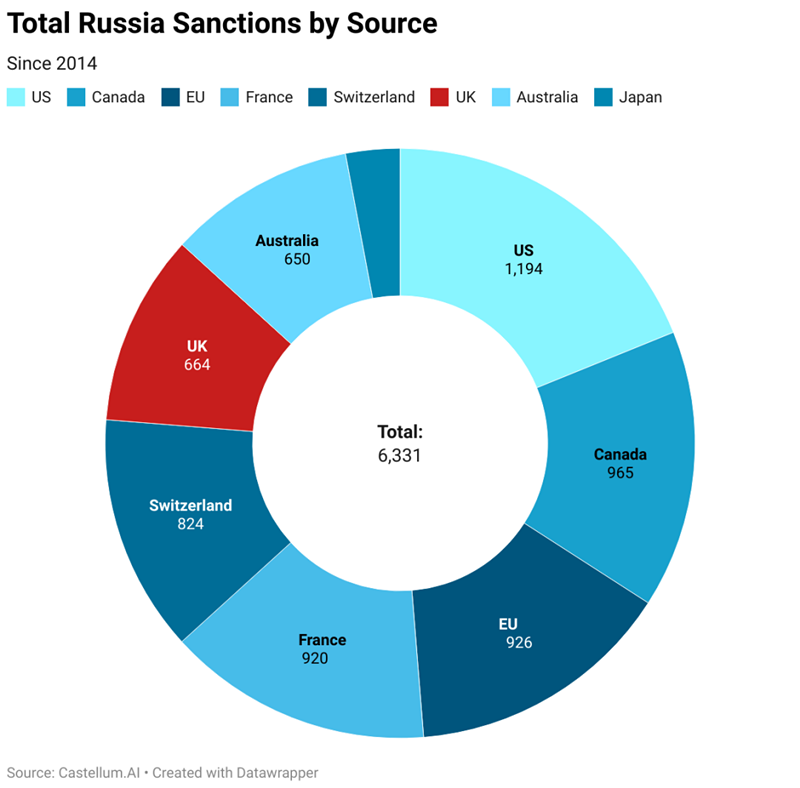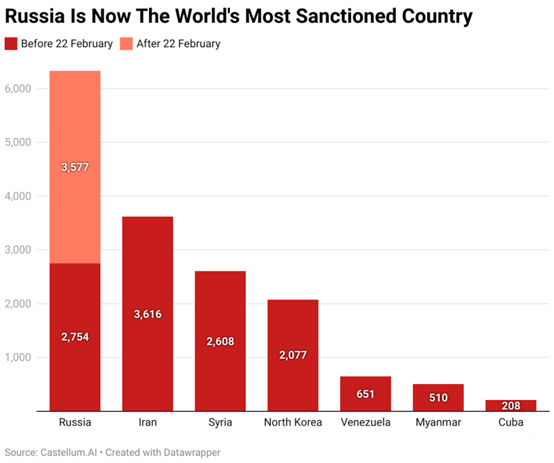 自从2022年2月24日,普京宣布对乌克兰发兵,美国、欧洲、澳大利亚和日本对俄罗斯实施了数千次制裁。根据全球制裁追踪数据库 Castellum.ai 截至3月12日公布了一份名单,其中俄罗斯以 6331 项制裁名列前茅,远远领先于第二名伊朗。其中美国制裁了1194次,加拿大制裁了965次,欧盟制裁了926次,法国920次,瑞士824次,英国664次,澳大利亚650次。