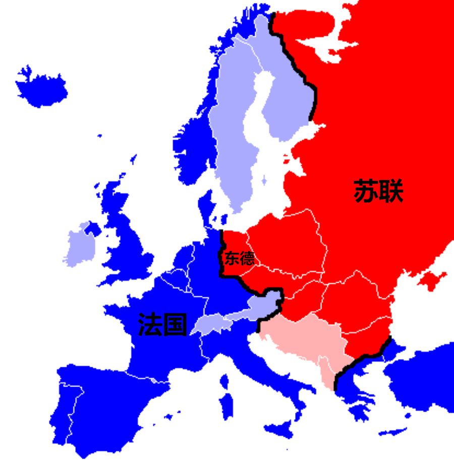 面对一片衰败的欧洲,美苏为争夺势力范围,积极扩张力量。苏联将它势力范围的西部边界推到东德,和法国近在咫尺。1949年4月4日,鉴于冷战因素以及担心苏联与东欧国家的可能“入侵”,美国、加拿大和包括法国在内的一些西欧国家组建了北大西洋公约组织(简称北约),以协调对任何可能攻击的军事反应。