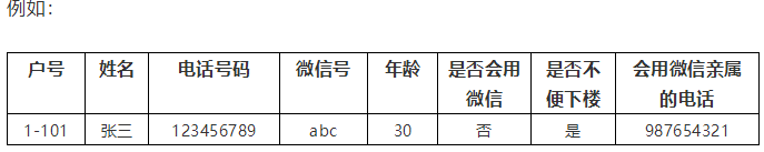 划分角色是为了减少志愿者的工作承担,毕竟这属于一个公益性质的组织。尽快收集业主信息,以楼栋为单位,由楼长完成收集,应收集到每户现住人口的信息,信息应包含:户号,姓名,电话号码,微信号,年龄,是否会用微信,是否不便下楼,会用微信亲属的电话。