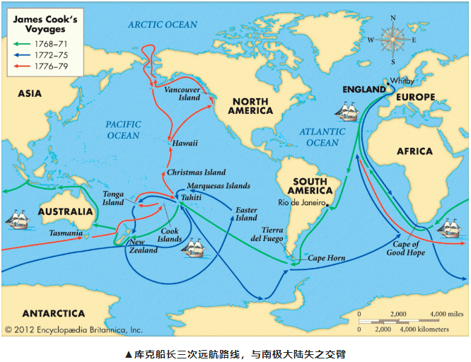 “我们比历史上任何航海家向南考察得更远”,库克船长用几乎冻僵的手指勉强握住笔杆,在航海日记上写道,“雄心促使我,去到任何人类能去的地方。”库克船长永远想不到,自己刚刚看到的冰,就属于人类寻找了近两千年的“未知南方大陆”——南极洲。直到46年后的1820年,人类才真正发现了南极大陆,不过英国人、俄罗斯人和美国人都宣称是自己第一个发现南极大陆的。