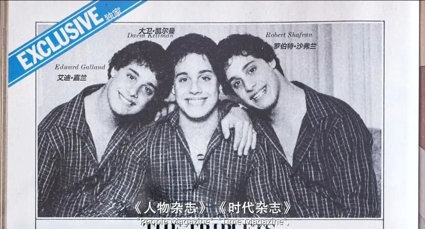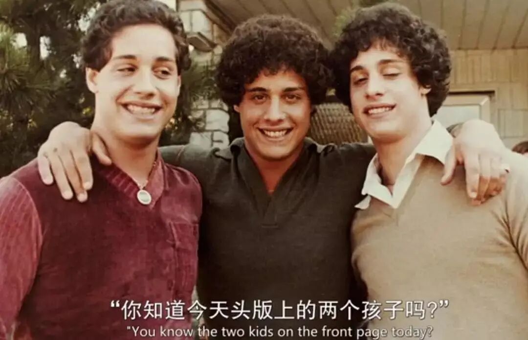 “是的。”鲍比如实回答。有个住校生比他还激动“你是不是出生于1961年7月12日,你有一个孪生兄弟!”(好家伙,开局就捡到一个失散十几年的兄弟)亲人重逢自然喜极而泣,故事传开后引起轰动。纽约报业的记者为抢头条,甚至不惜打直升机飞来。兄弟俩人的事迹通过媒体,传遍了整个纽约城。与此同时,一位叫大卫的年轻人,也看到了报道。他照了照镜子,很快意识到,报纸上的两个人是自己的孪生兄弟。(生日相同,都是被领养的,长得几乎一个模子刻出来)。问题来了,三兄弟谁是大哥呢?