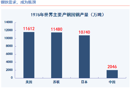 1949年,我国钢产量只有15.8万吨,每家每户打把菜刀都不够,百废待兴钢铁奇缺,中国钢铁工业进入的黄金时期。大炼钢铁时期,国务院机关也砌了炉子,把几个铁栅栏门都弄去炼钢了,领导人也身先士卒,有事没事敲几锤子,1958年中国的钢产量达到了800万吨;三线建设,把钢铁工业藏到深山老林。