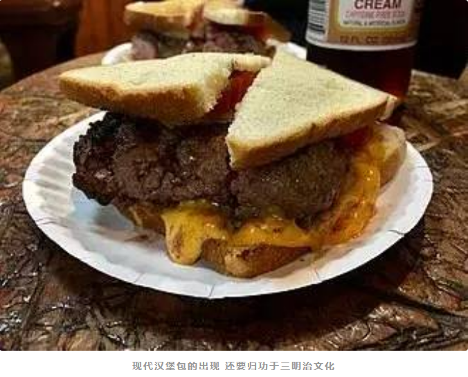 19世纪和20世纪初,超过500万德国移民从汉堡港出发,前往美国。早期的移民航行中,乘客需在三等舱的甲板间中自备食物。旅行者把热圆包作为补给品带在身边,因为它便于运输,且价格便宜。到了美国后,人们对这道菜稍作修改,把肉饼塞进三明治面包,以移民曾经出发的地方命名,称为“汉堡包”,并在新大陆流传开来。