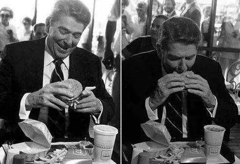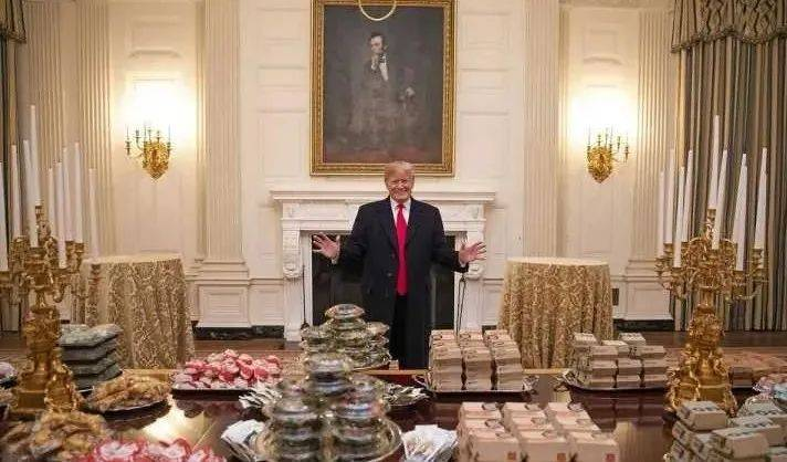克林顿、小布什、奥巴马,近几届的美国总统无不是汉堡包的爱好者。奥巴马把去麦当劳作为政治秀的一部分,除了自己排队买汉堡,还把时任俄罗斯总统梅德韦杰夫请到街边的汉堡店一同就餐。特朗普则是妥妥的“垃圾食品”收集者,最喜欢的品牌有四个,依次是麦当劳、肯德基、必胜客和可口可乐。在白宫、空军一号和其他场合,你总能在特朗普身边看到吃完或者没来得及开封的汉堡包纸盒。特朗普甚至还用垒得像小山一样的麦当劳汉堡包和薯条,去招待白宫的贵客。他不惜溢美之词评价汉堡包:伟大的美国食品。