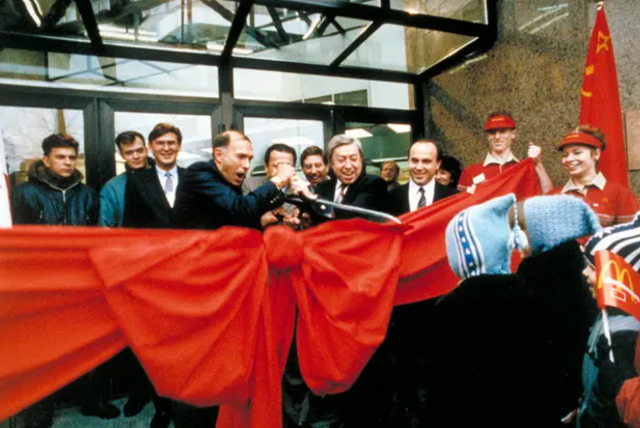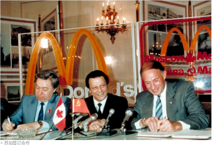 从上世纪70年代开始,麦当劳就想进入苏联市场,但谈着谈着,苏联先入侵阿富汗。美国要求全面抵制苏联的一切,谈判眼看就这样被搅黄了。麦当劳不死心,换成加拿大麦当劳继续跟苏联谈。