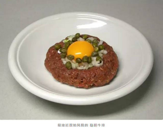 公元13世纪,蒙古军队在草原上崛起,短时间内横扫欧亚大陆。因为要长时间行军,战士不得不制作一些便于保存和携带的应急食物。他们将肉弄碎,挤压成肉饼,制成了最原始的汉堡肉饼。长期遭蒙古统治的俄罗斯人,也接受了这种食品,管这个叫鞑靼牛排steak tartare。通过汉萨同盟的波罗的海经济圈,德意志商人将鞑靼牛排从东欧带到西方。当地厨师改良这道原始食物,加入配料酱汁,使其更加美味。