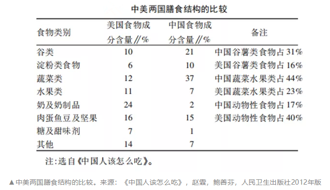 美国膳食结构中的动植物性食物占40%,蔬菜水果类占23%,谷薯类食物仅占16%。对比中美两国传统膳食结构,中国的动物性食物仅占17%,而蔬菜水果类占44%。可以说是相当清淡了。