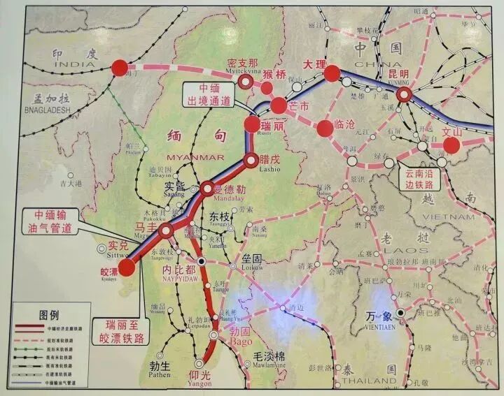 2018年,中缅签署皎漂深水港项目框架协议,着力打造这个印度洋港口。皎漂是缅甸西边沿海城镇,也是中缅油气管道的起点。中国打算在皎漂兴建个深水港,从云南以铁路和公路穿梭缅甸北部,打开中国通往印度洋的陆路。该港口主要由中国出资,相应地中国将获得50年运营权。中缅铁路建成后,大批货物将可通过皎漂港经中缅铁路直达云南等西南区域,也而不必再长途跋涉绕经马六甲。
